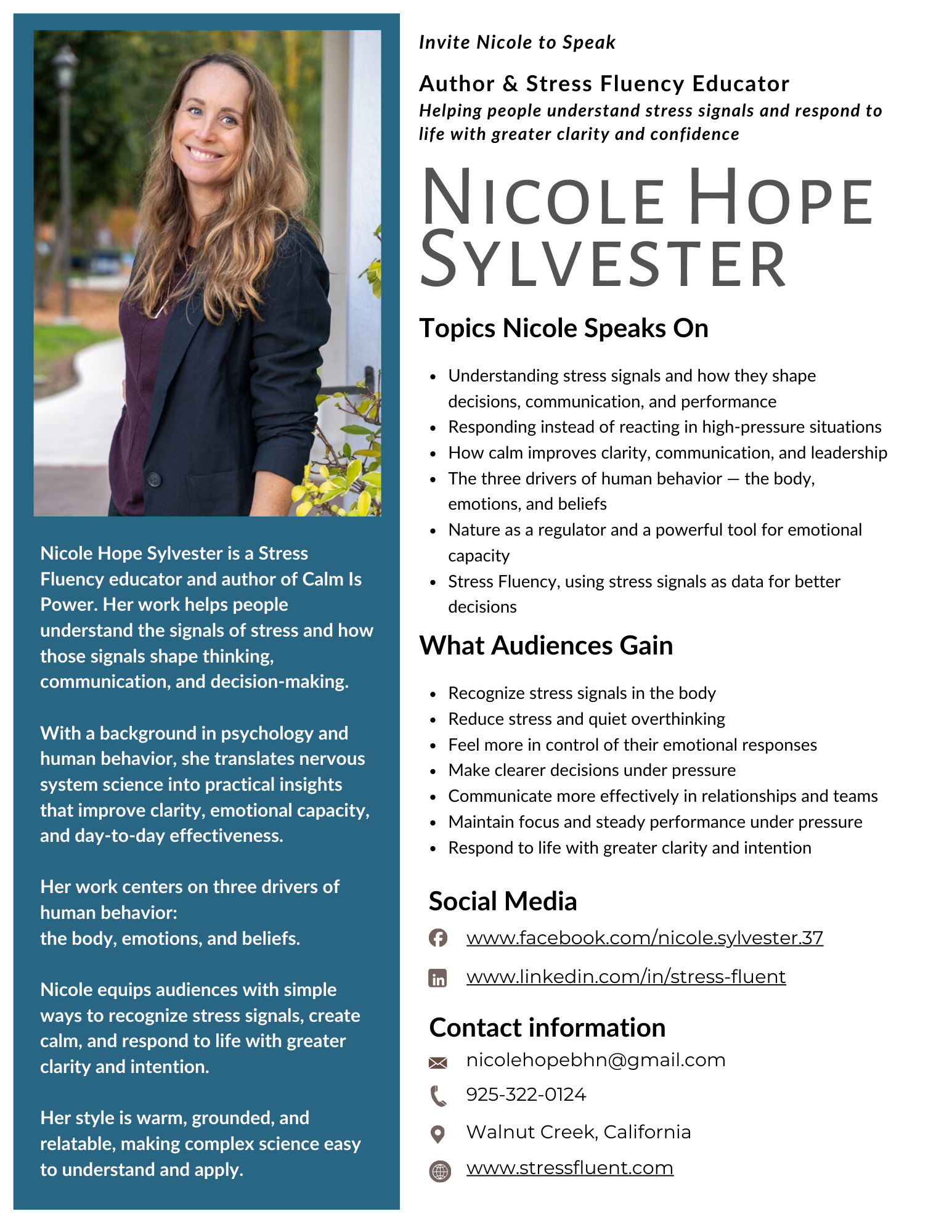 Nicole Hope Sylvester speaks about the connection between stress signals, awareness, and personal power. Her talks help audiences understand how stress signals influence reactions, decisions, communication, and relationships.
